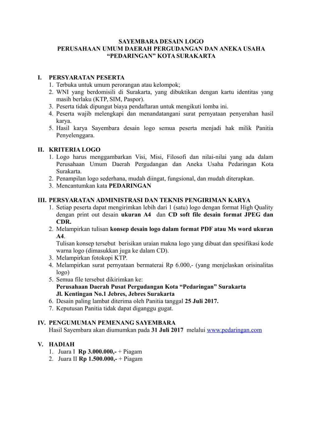 Berita, Eksternal, Info Pedaringan PENGUMUMAN PEMENANG SAYEMBARA LOGOby pedaringan solo4 September 2017